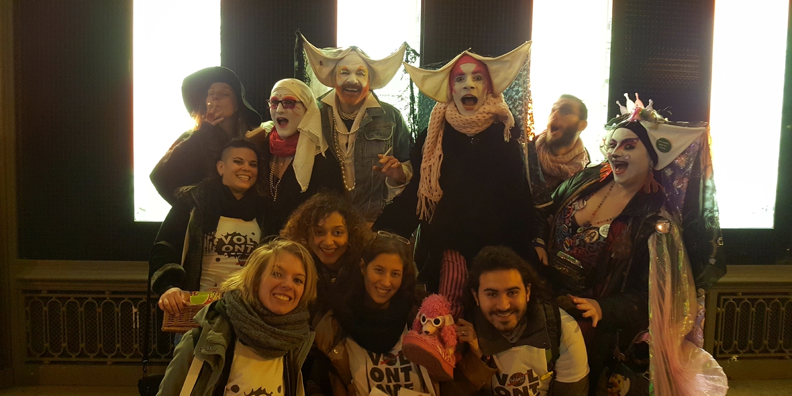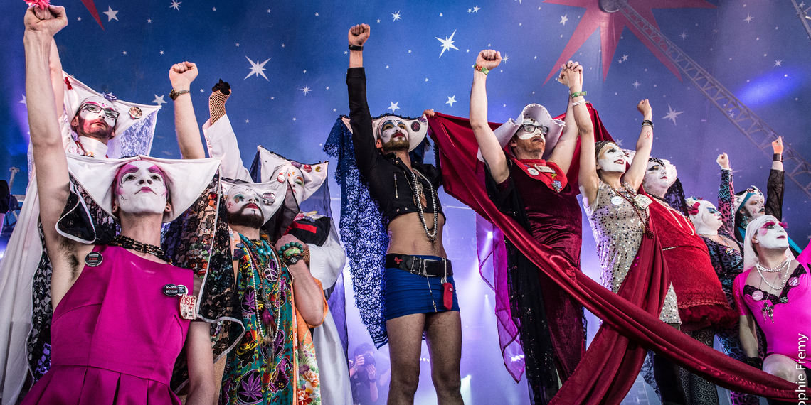 Sœur Rose : Nous sommes un ordre pauvre, agnostique et dérisoire de folles radicales. Tout a commencé en 1979 à San Francisco le dimanche de Pâques. Des amis se faisaient chier, ils avaient des robes de bonnes sœurs dans leurs penderies et ils se sont dit : « Tiens, si on allait faire les connes dans le quartier gay. ». À l’époque, dans les bars gay, il fallait être viril, avoir un pantalon de cuir, un débardeur blanc et une grosse moustache. C’était une image très stéréotypée, limitante et oppressante. Ils sont sortis dans la rue avec leurs grosses barbes, leurs tenues de bonnes sœurs, leurs voiles noirs et ont débarqué dans les bars. Et là, au lieu de se marrer comme ils s’y attendaient, les gens sont venus les voir en se disant : « Chouette, des bonnes sœurs qui nous ressemblent, à qui on va pouvoir raconter nos histoires, nos problèmes… » et il s’est passé un vrai truc dans l’échange avec les gens, une réelle interaction. En quelques mois, les Sœurs ont trouvé le nom et elles ont commencé à sortir, à militer, à être présentes sur des manifestations. Leur première manif fut contre l’assassinat de bonnes sœurs par la CIA au Salvador, et la suivante suite à l’accident de Three Mile Island, qui est le plus gros accident nucléaire civil aux États-Unis. Deux sujets très différents mais avec la volonté d’être un ordre dans la cité, conscient de ce qui s’y passe, à son service et de ses humains.